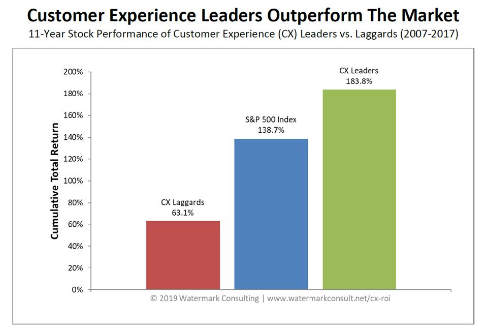 通过对十多年的客户体验和股票表现数据进行分析,该研究发现,领先于客户体验的公司(由第三方消费者调查证明)往往优于落后的公司。差距并非微不足道:在分析的11年时间里,客户体验领导者的表现落后于落后者近3比1。