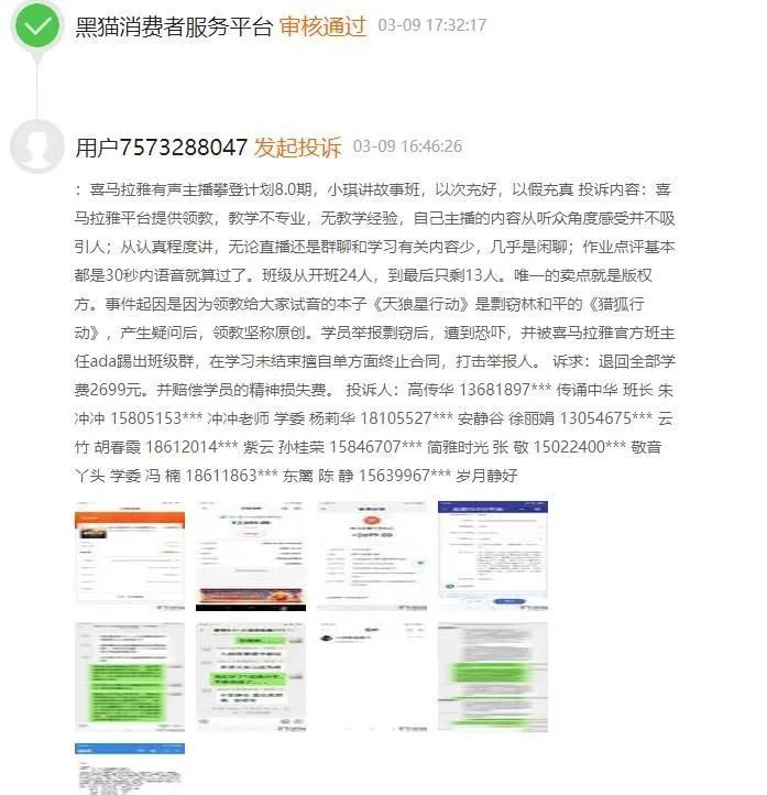 “喜马拉雅平台提供领教,教学不专业……班级从开班24人,到最后只剩13人。唯一卖点就是版权方。投诉起因是因为领教给大家试音的本子《天狼星行动》是剽窃林和平的《猎狐行动》,产生疑问后,领教坚称原创。”上述投诉晒出聊天记录、转账记录等称,学员举报剽窃后,遭到恐吓,并被喜马拉雅官方班主任踢出班级群,在学习未结束擅自单方面终止合同。